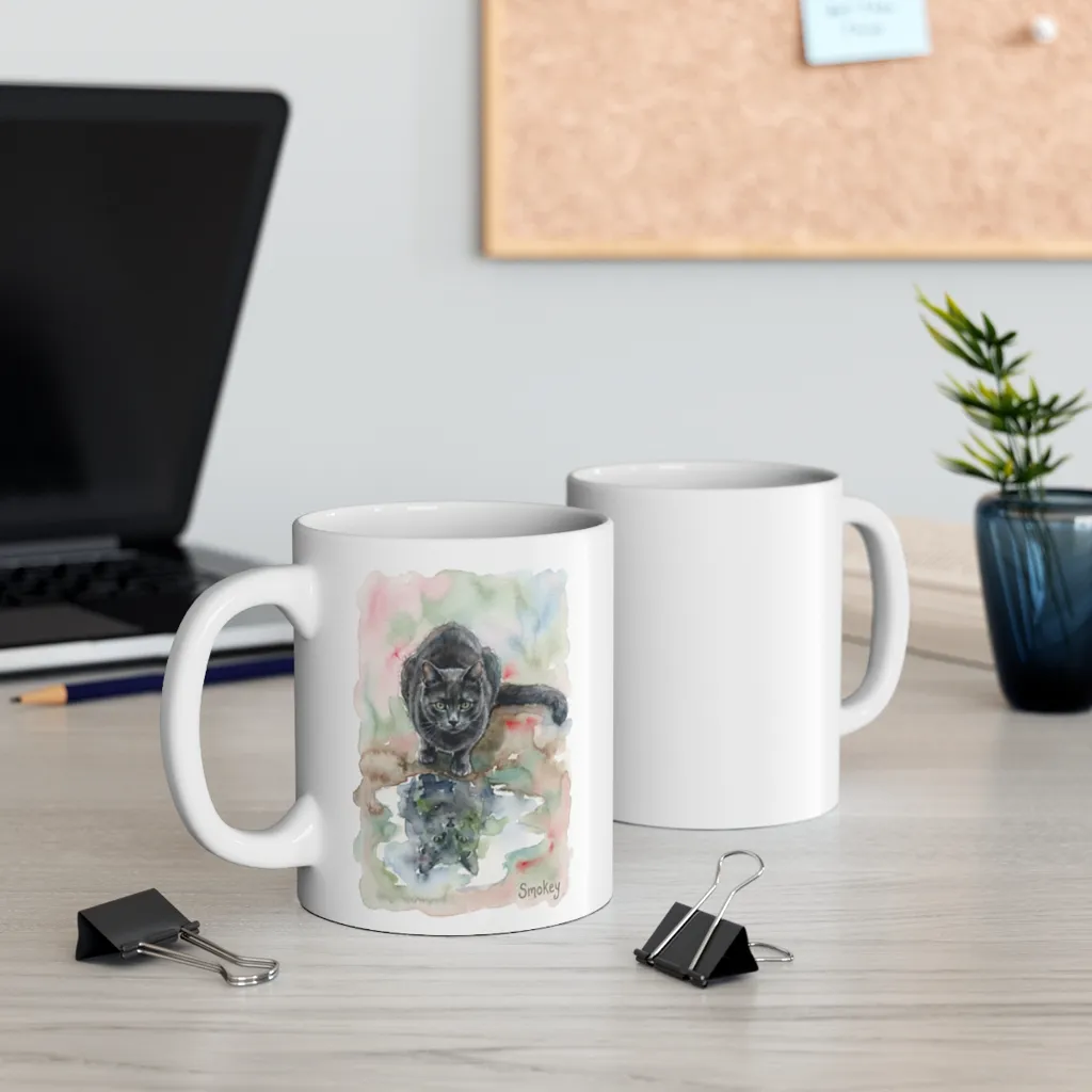 Luminous watercolor captures a discerning grey cat gazing at its watery reflection, creating a whimsically contemplative mood.