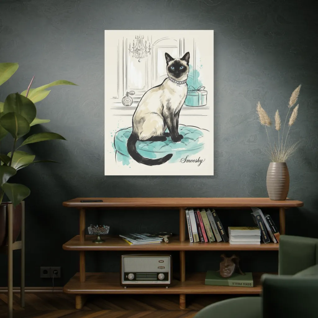 A whimsical watercolor sketch depicts a fancy Siamese cat, bejeweled and poised on a turquoise ottoman, capturing pure, pampered sophistication. Smooshy, looking purr-fectly poised and pampered, clearly owns both the diamond collar and the entire luxurious room.