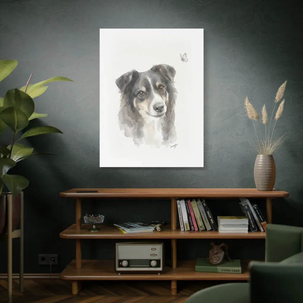 This soft watercolor portrait captures a curious dog's gentle gaze at a delicate butterfly, evoking a warm, serene innocence.