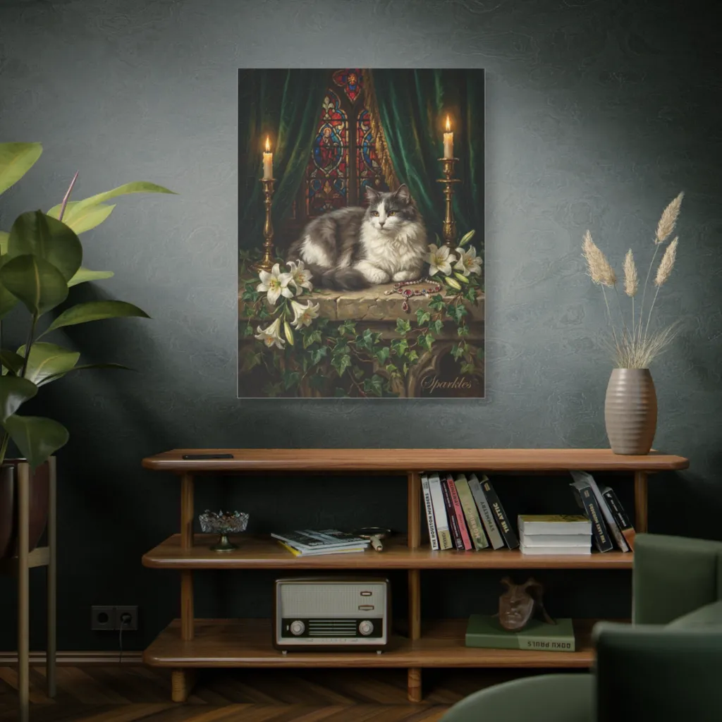 Sparkles' Sacred Vigil demands a moody library or sophisticated study. Place it above a dark walnut console with brushed brass accents and deep velvet seating. Exquisite sophistication for a discerning space.
