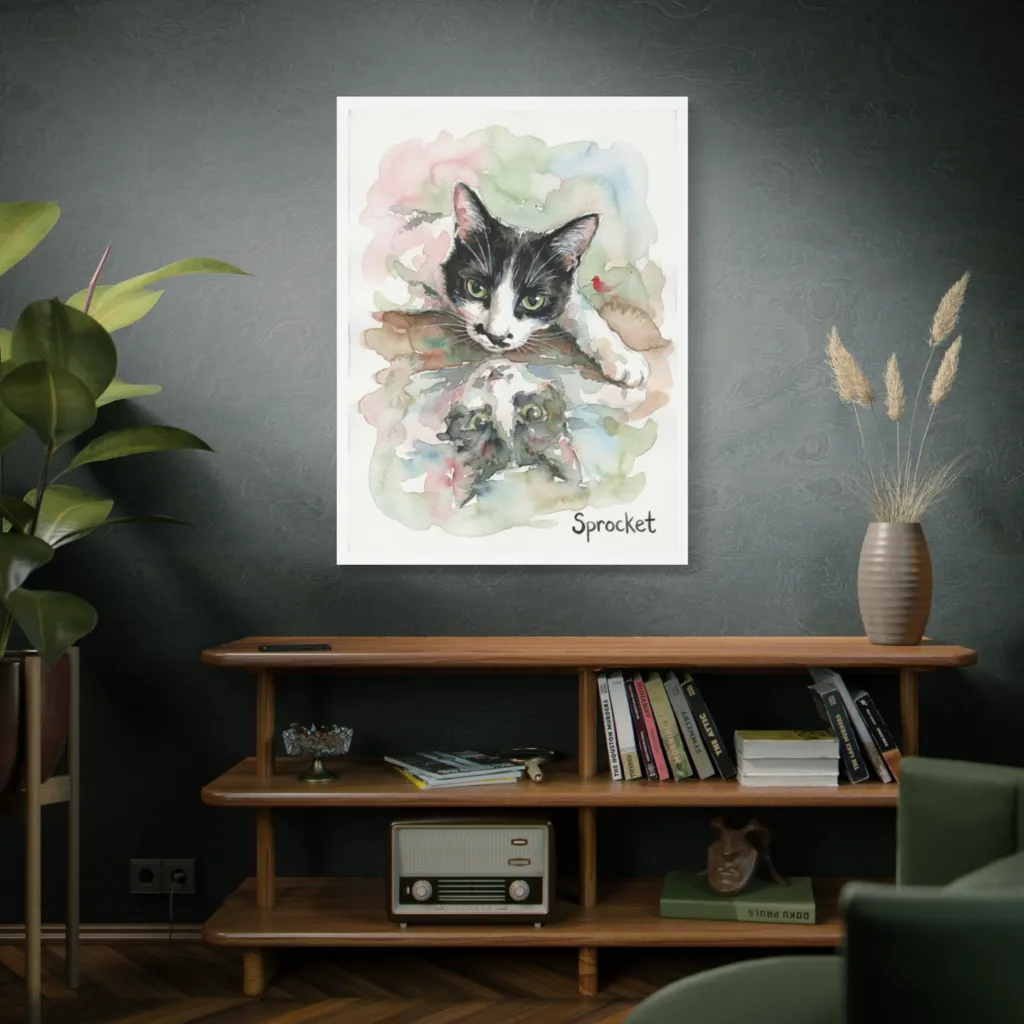 A vibrant, loose watercolor playfully captures a curious tuxedo cat peering into its dreamy reflection with whimsical charm. Sprocket, with emerald eyes, playfully wonders if his watery twin also dreams of chasing tiny red birds.