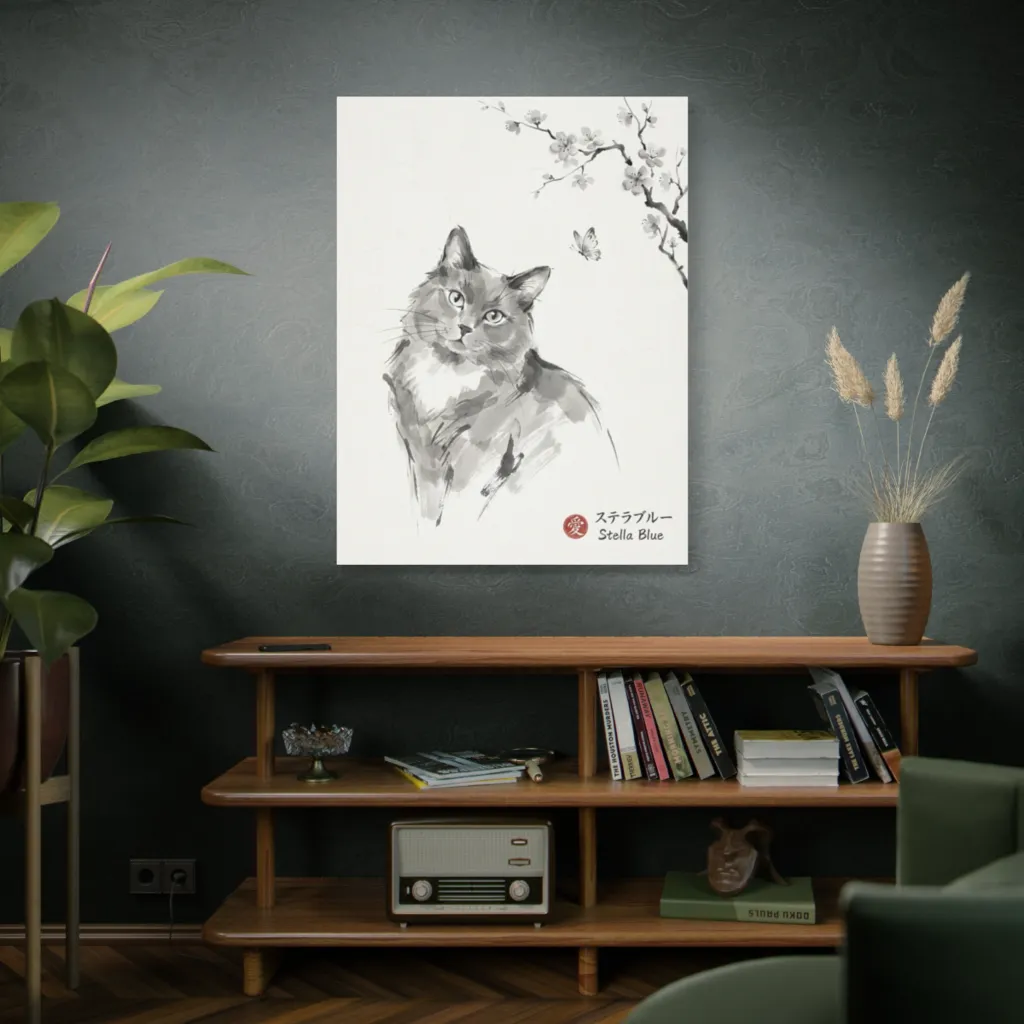 An ink-wash cat, keenly observing a butterfly amidst delicate cherry blossoms, embodies a moment of serene, playful contemplation.