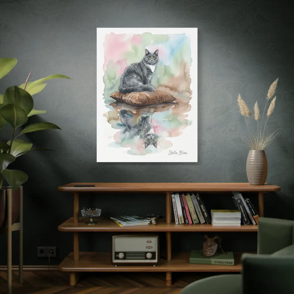 "Stella Blue's Aqueous Dream" achieves a sublime juxtaposition of feline serenity and aqueous reflection. The tonal harmony and whimsical brushwork evoke a visceral curiosity, bordering on avant-garde genius. Picasso, eat your heart out.