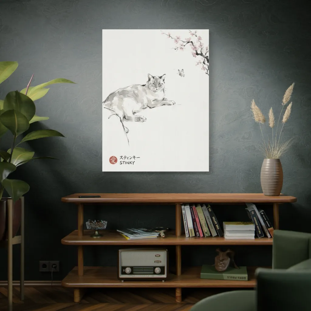 This elegant sumi-e captures a serene cat's contemplative gaze at a butterfly beneath delicate cherry blossoms, evoking a tranquil, playful mood.