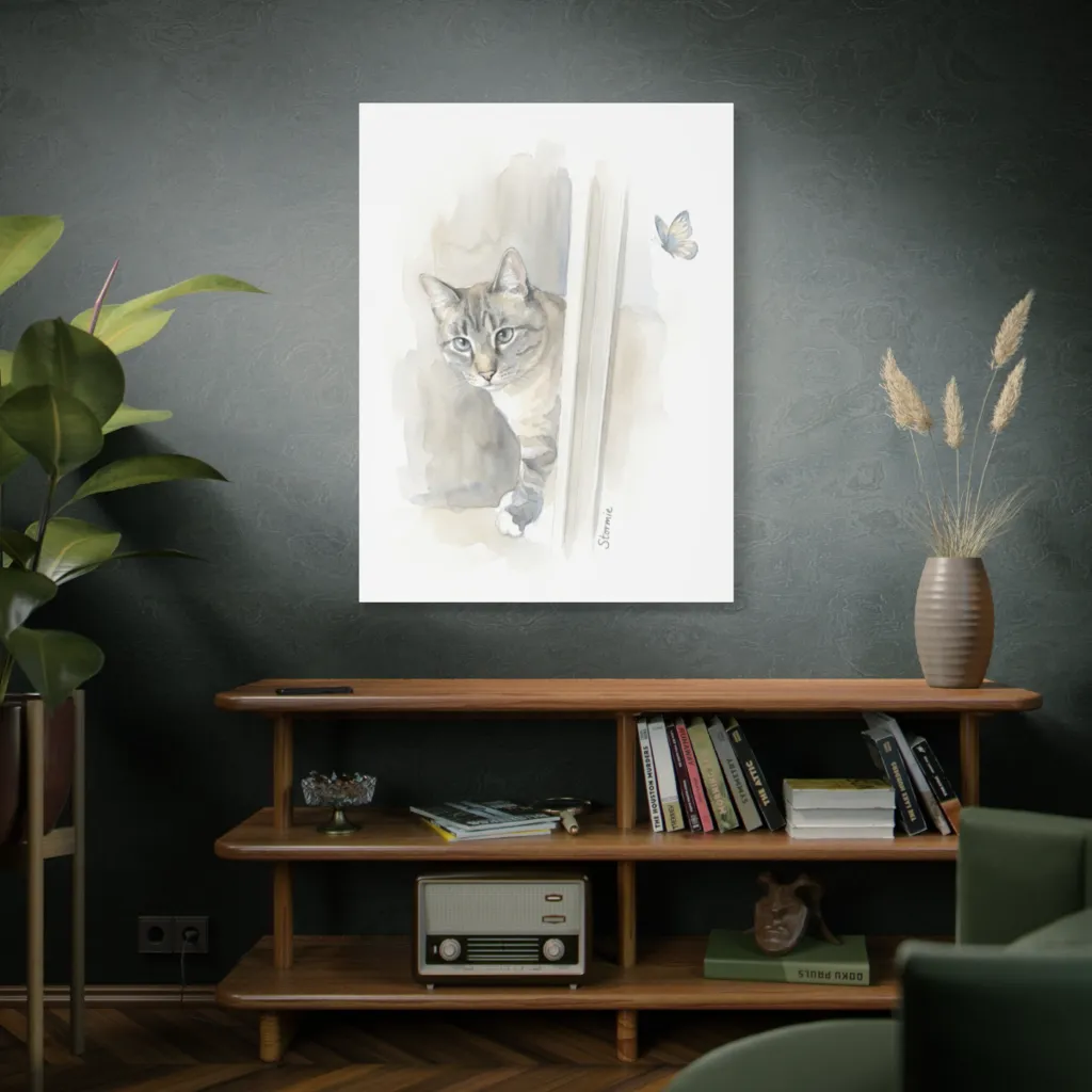 Stormie, master of stealth and subtle charm, quietly plots her next move against a whimsical butterfly.