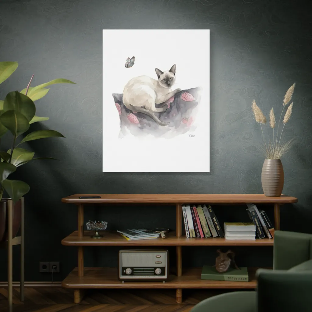 Cleo's avant-garde watercolor serenity creates a visceral juxtaposition with the scattered strawberries. The tonal harmony is an evocative masterpiece, proving even domestic pets can achieve Louvre-level grandeur.