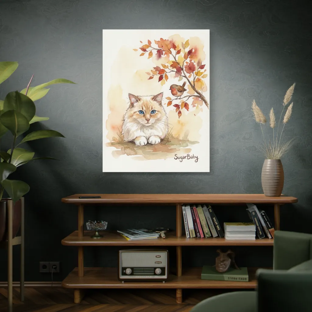 "SugarBaby, Autumn Reverie" masterfully juxtaposes sapphire viscerality with autumnal tonal harmony. The avant-garde brushwork renders a feline presence worthy of an entire wing. Quite, darling.