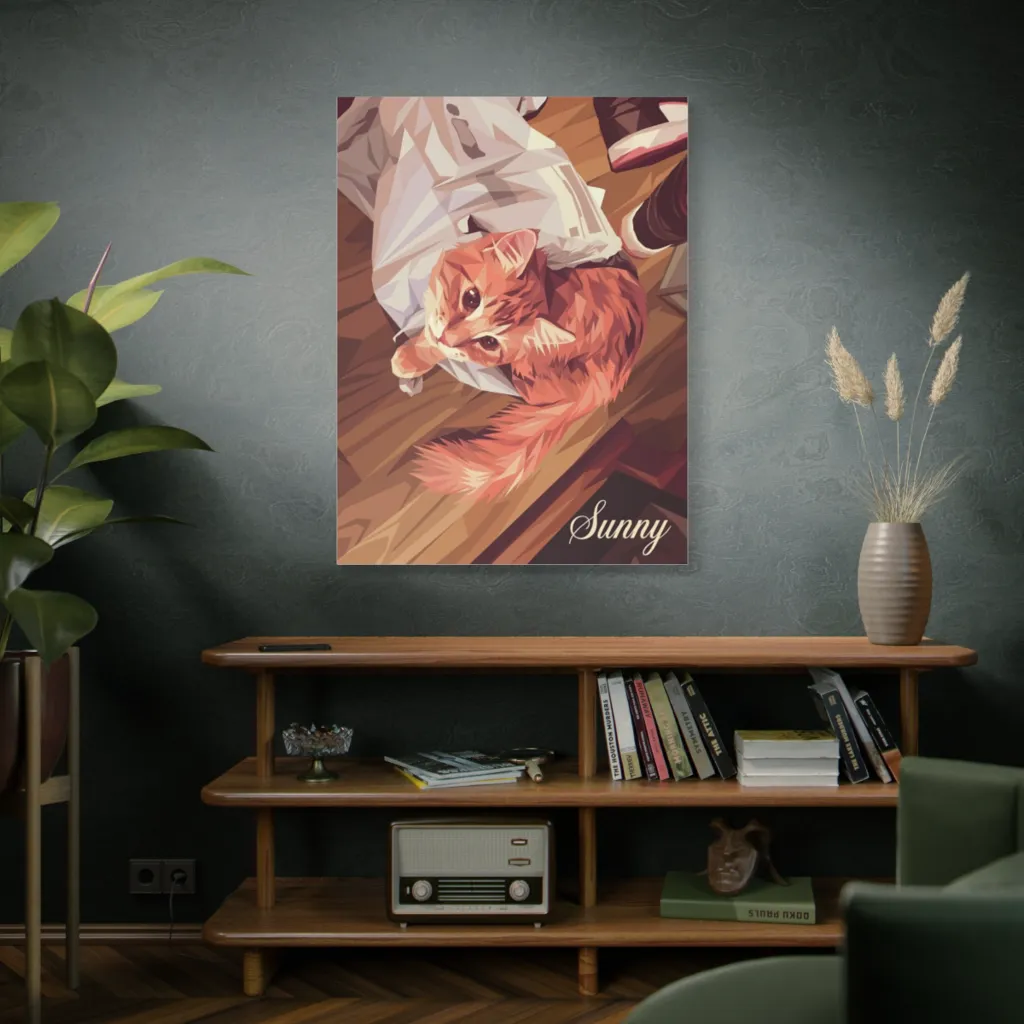 Geometric charm meets feline mischief as an orange cat pops from a bag with wide-eyed curiosity in this vibrant digital piece. Sunny, clearly deeming this crinkly bag her purr-fectly posh new lair, plots delightful mischief.