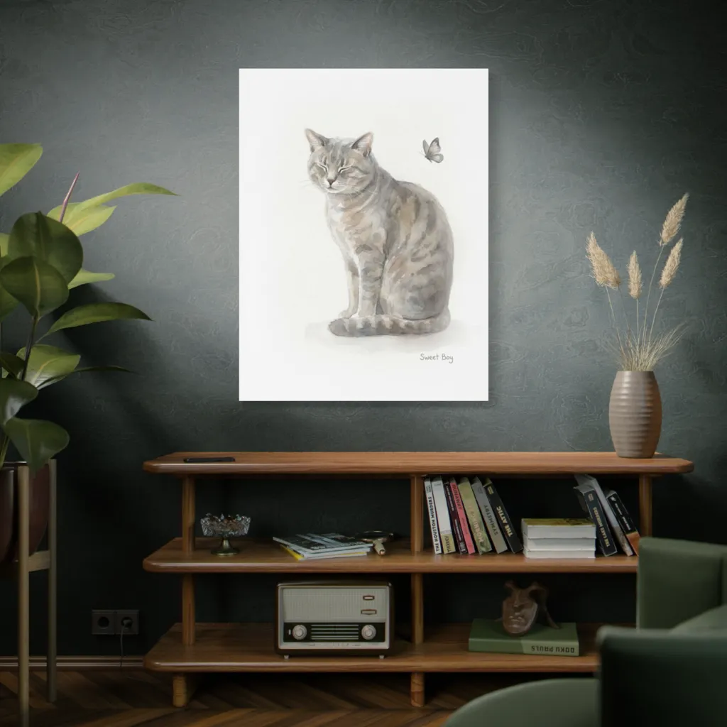 Sweet Boy's serene stance and blissful disregard for the butterfly perfectly capture his gentle, sleepy soul. His unique tabby charm and tranquil expression truly reveal a beloved companion's inner peace.