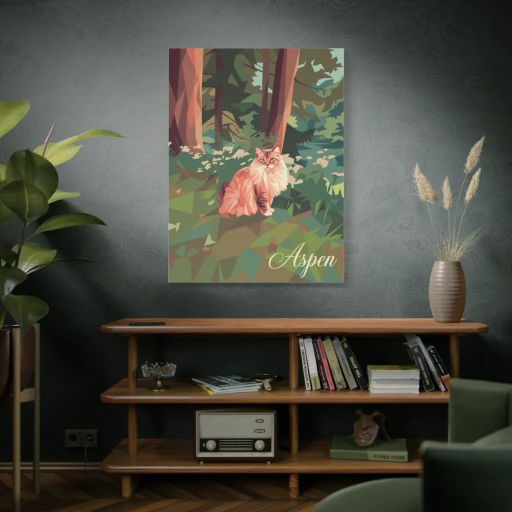 This low-poly masterpiece features a fluffy, watchful cat amidst serene, geometric woodlands, exuding understated charm. Aspen, the stylish polygonal purr-fection, confidently lounges in her own geometric woodland paradise.