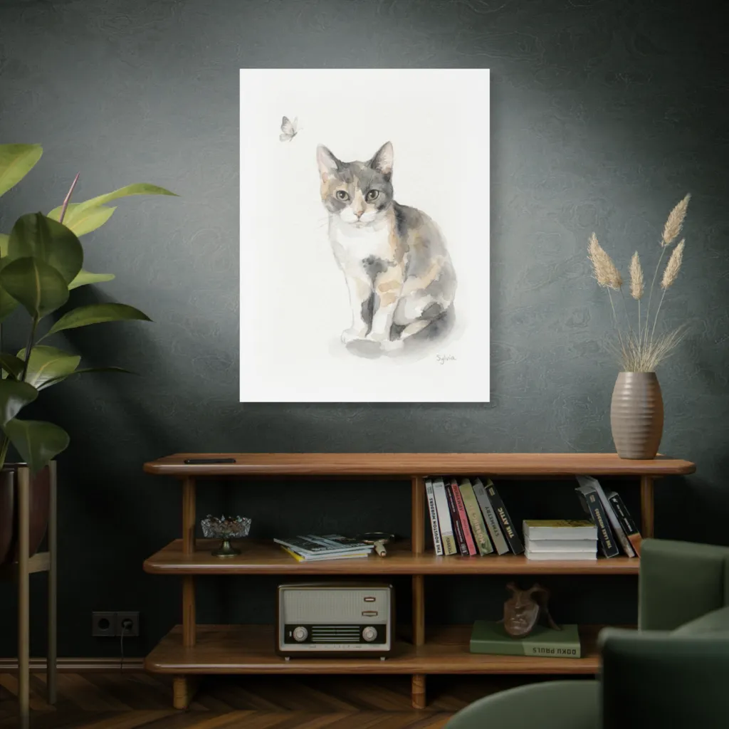 This delicate watercolor depicts a tranquil calico cat observing a butterfly with soft, curious charm. Sylvia, the painted feline, offers a soft, curious gaze, charmingly pondering the butterfly's ephemeral dance.