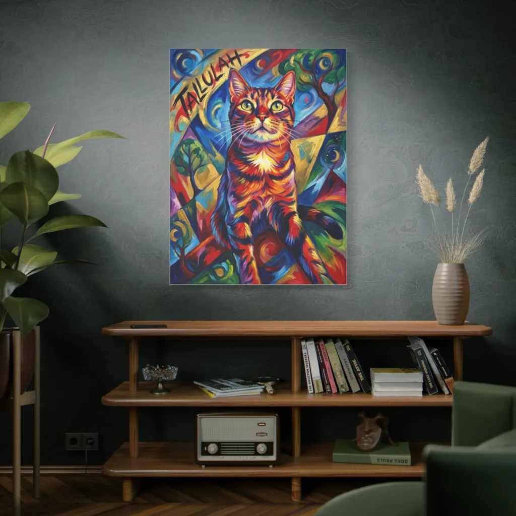 Tallulah, a glorious kaleidoscope cat, reigns over an energetic, abstract wonderland with a gaze full of vibrant mischief.