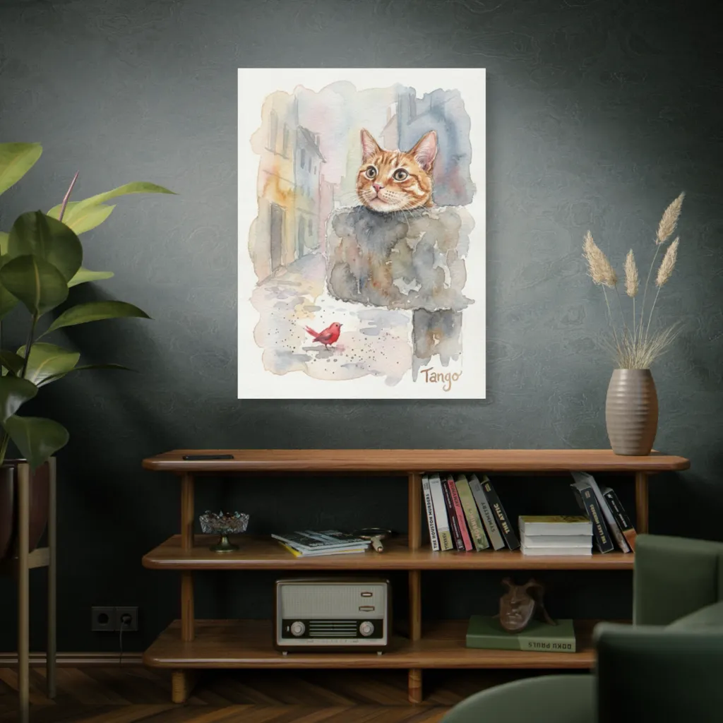 This piece innovatively blends traditional watercolor's softness with a contemporary digital sensibility. The dreamlike street scene and whimsical characterization, particularly Tango's curious gaze, create a captivating, modern pet portrait. It's bold, fresh, and perfectly curated.