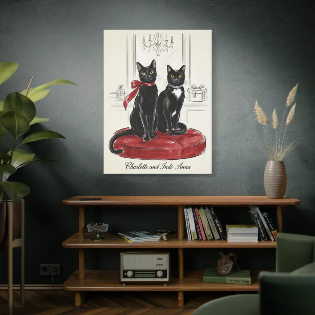 **Art Critic:** Elegant ink and wash renders two glamorous black cats on a red cushion, exuding playful, sophisticated charm.