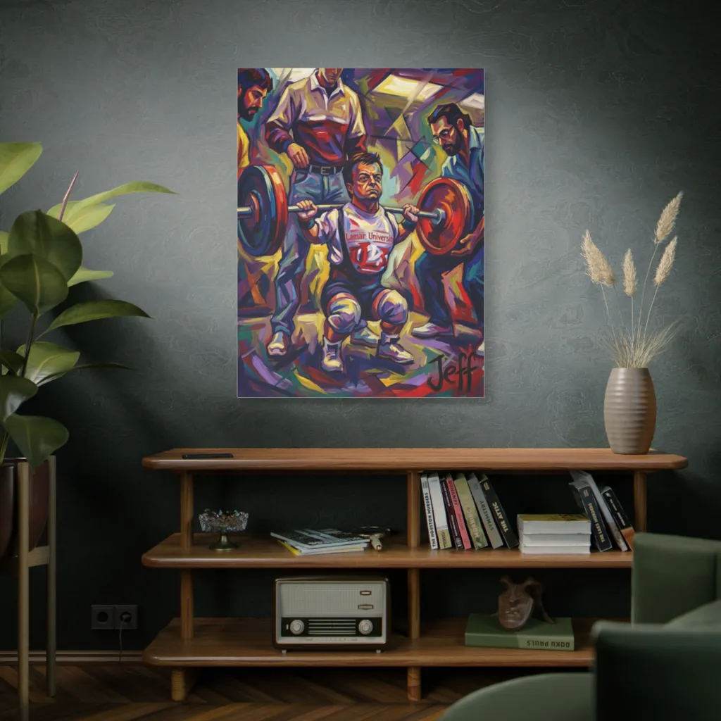 Jeff's determined stance and intense focus truly reveal his powerlifting soul. The fractured cubism splendidly captures his raw strength and unique gusto. This artwork beautifully expresses his unique, indomitable spirit. A remarkable portrait.