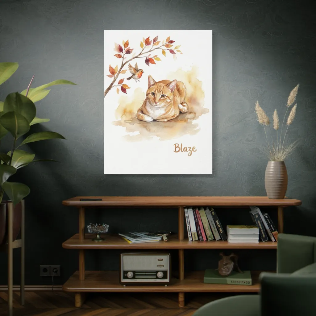 This charming watercolor captures a watchful ginger cat and a curious robin under soft autumnal foliage, exuding quiet warmth. Blaze, a perfectly autumnal ginger, seems utterly unconcerned by his tiny feathered neighbor... for now.