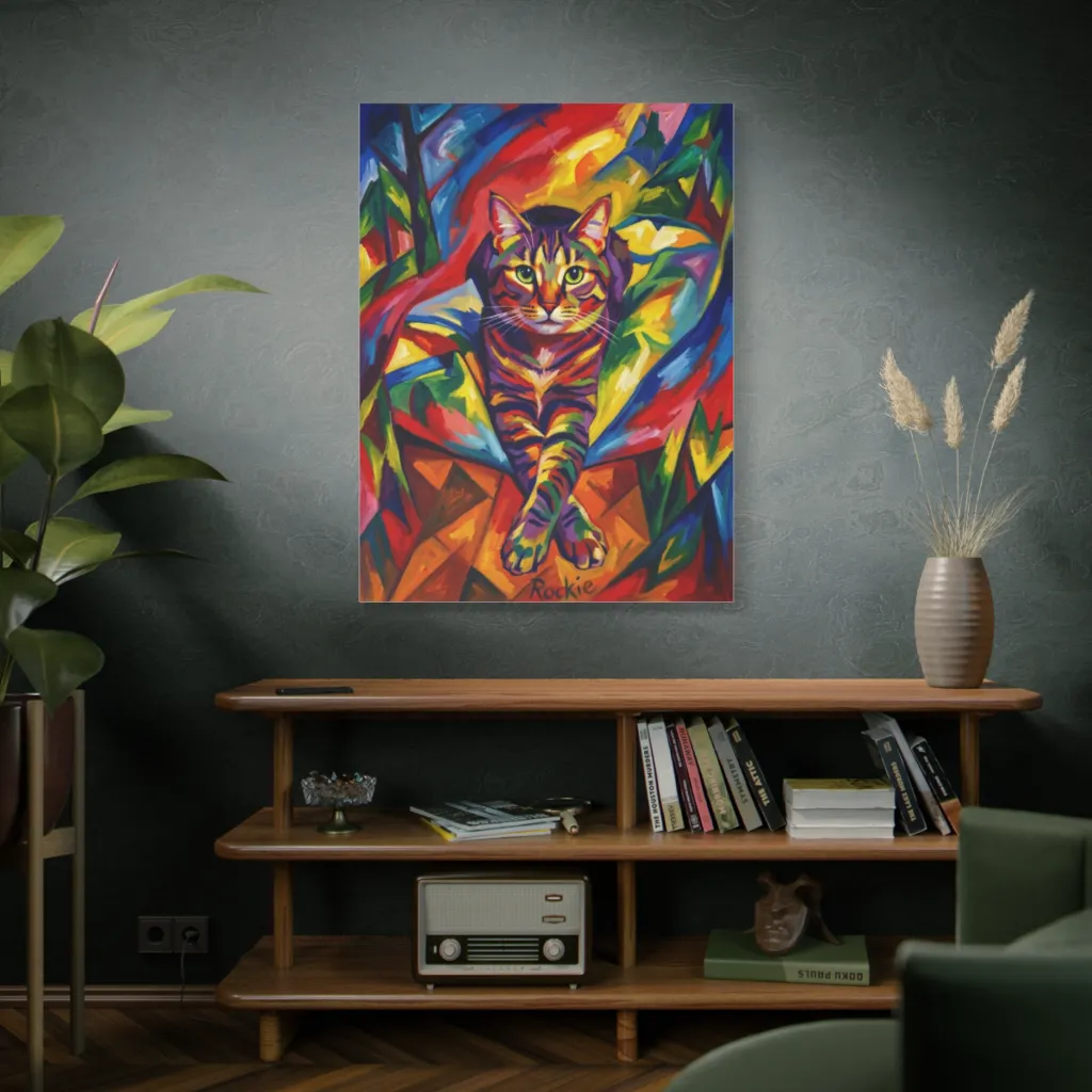 Rockie, a technicolor tabby, confidently struts from this vibrant canvas, proving some cats are born to be abstract stars.