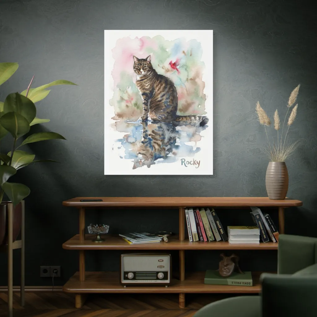 This expressive watercolor captures a regal tabby contemplating its watery reflection, a fleeting cardinal adding a touch of playful, watchful wonder.