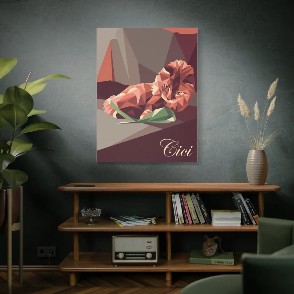 This cubist Cici brilliantly marries traditional portraiture with digital-age geometry. The faceted structure and watchful glint showcase bold, innovative techniques, creating a wonderfully sharp, contemporary feline aesthetic.