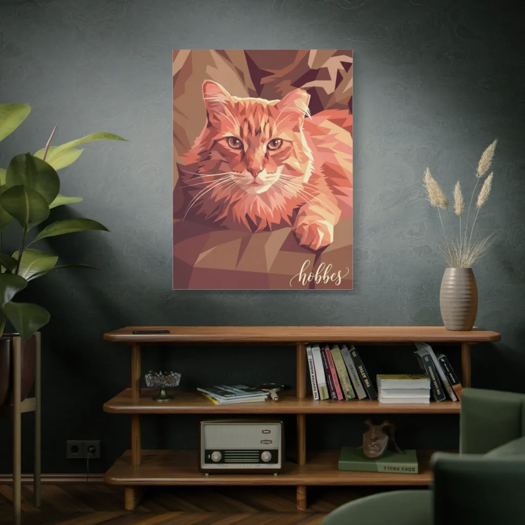 This geometrically rendered ginger cat has the dignified swagger of Hobbes, pondering his next philosophical musing or playful pounce.