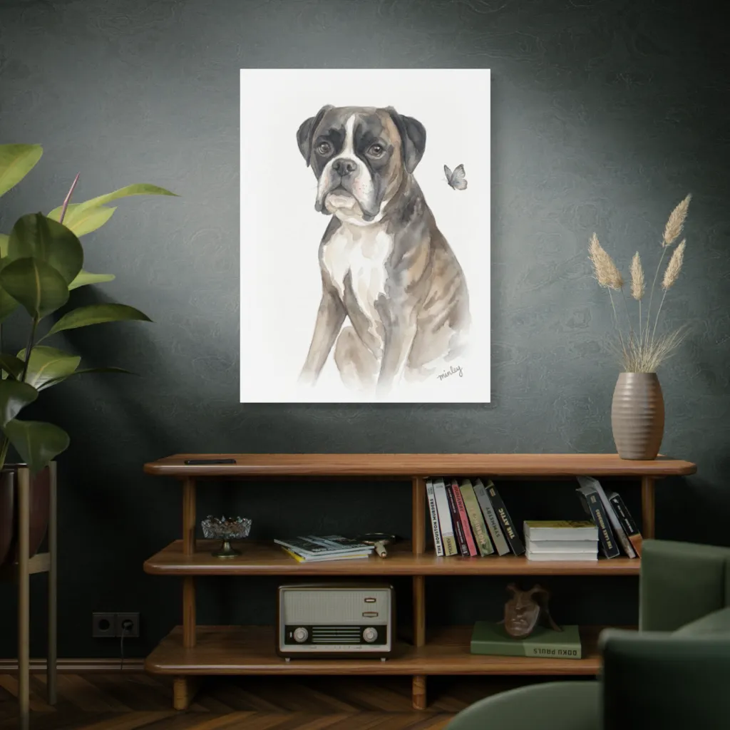 Minley's dignified stance and watchful gaze perfectly capture a soulful, gentle spirit. The butterfly interaction reveals a deep, sweet curiosity, making this boxer truly special. A masterpiece of character!