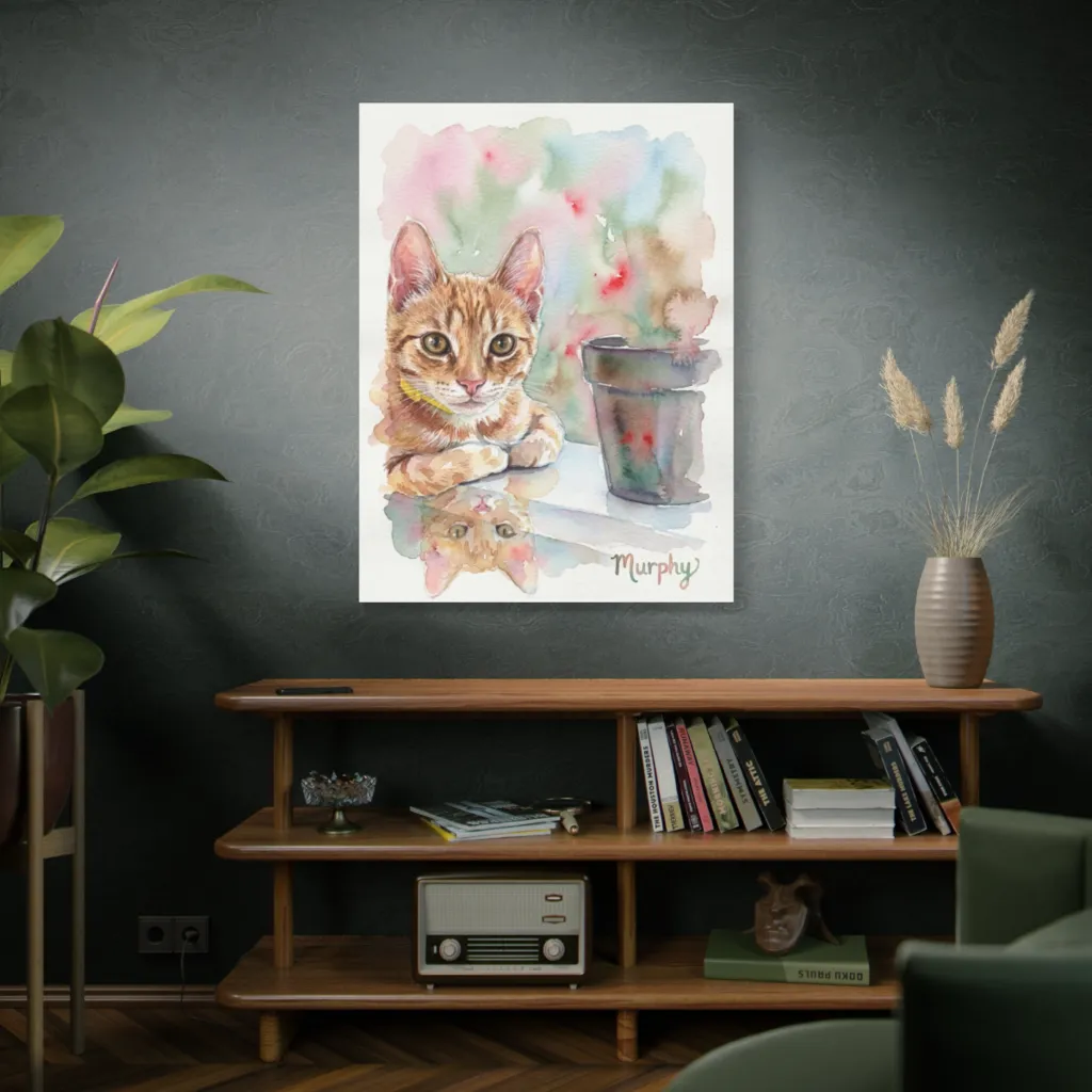 Loose watercolors capture a curious tabby cat and its reflection, radiating watchful charm with a delightful splash of color.
