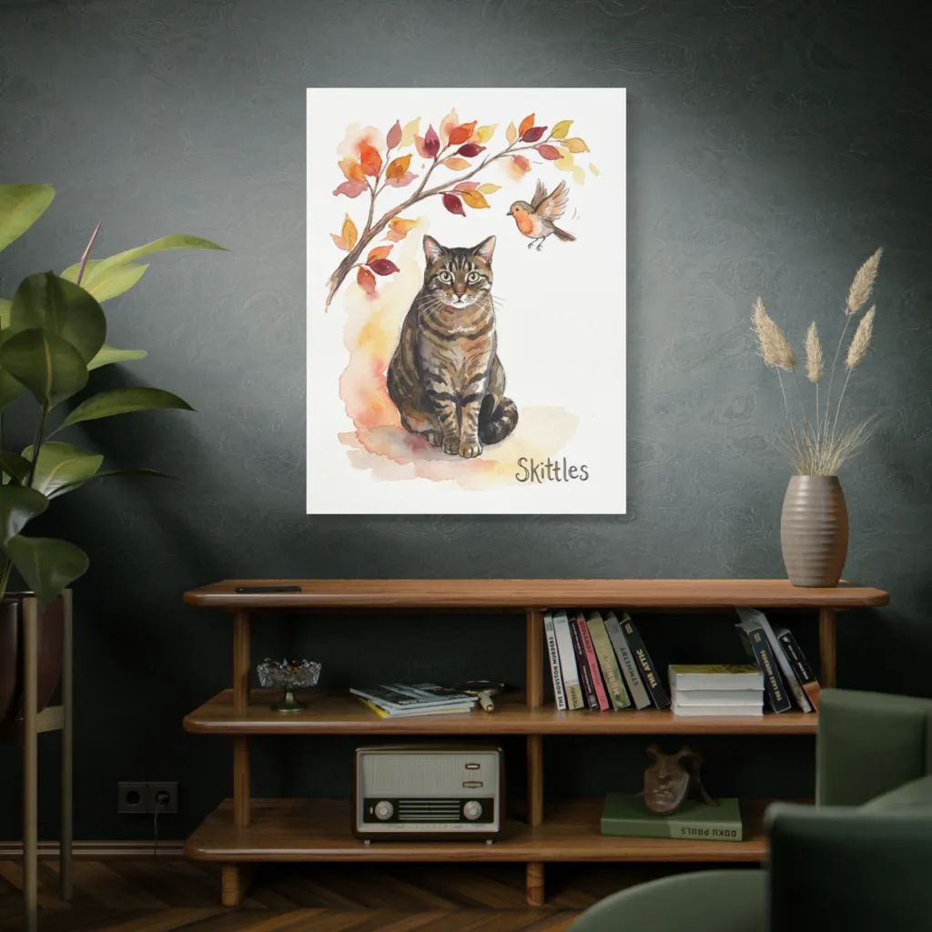This charming watercolor depicts a watchful tabby cat beneath an autumn branch, a bird mid-flight, evoking a gentle, autumnal whimsy.
