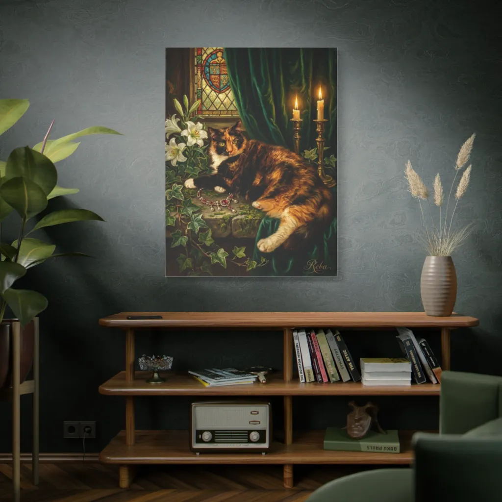 Opulent Victorian realism elevates a regal calico cat to pampered royalty amidst gothic finery and shimmering jewels, exuding luxurious mystery.