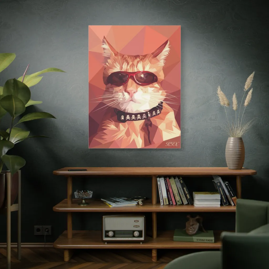 A low-poly, pop art feline with shades and a skull collar projects a fiercely cool, rebellious attitude.