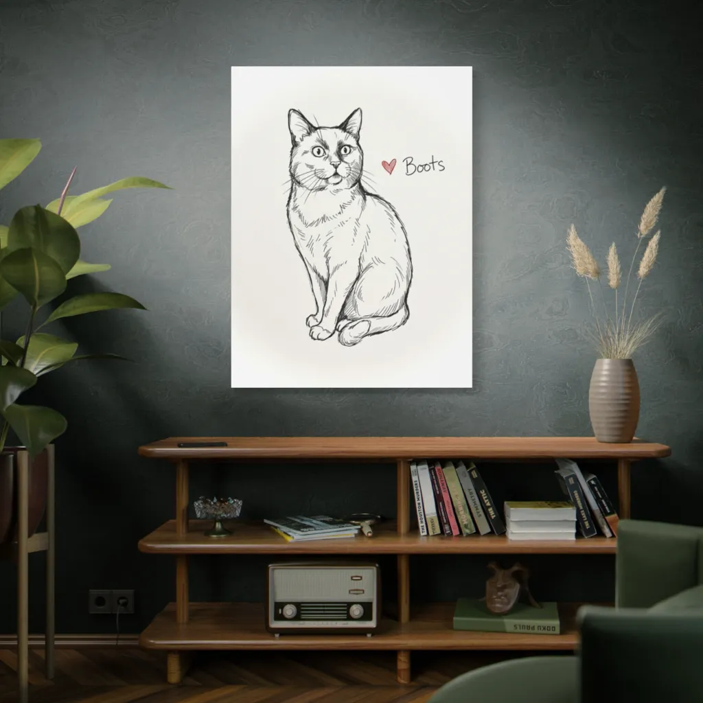 "The Gaze of Boots" digitally translates traditional pen-and-ink artistry into a captivating contemporary vision. Its clean lines and evocative presence feel boldly experimental. A fresh, innovative take on classic pet portraiture for modern screens.