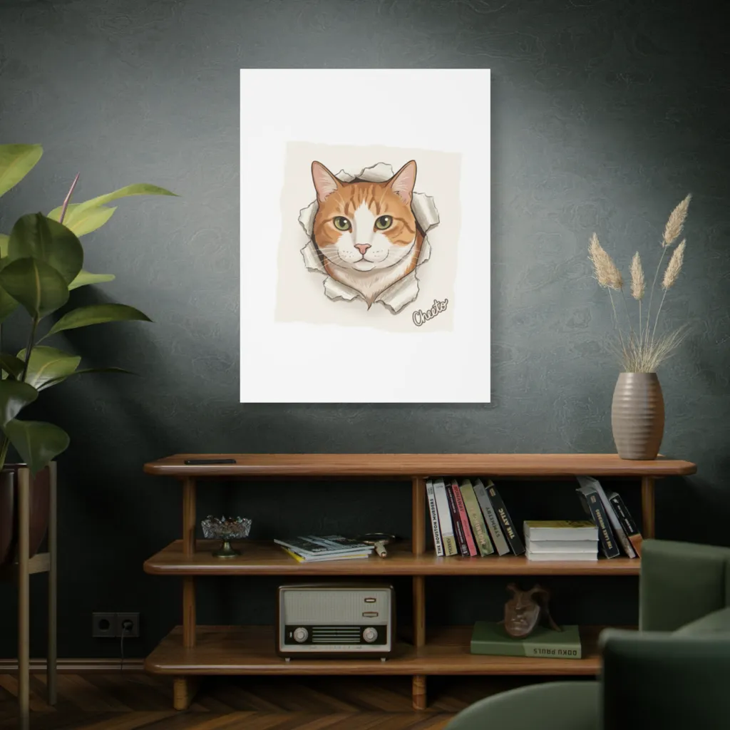 A bright, cartoony orange tabby playfully tears through paper, creating a cheerful, curious portrait. Clearly, Cheeto the cat decided mere paper couldn't contain its purr-fectly cheesy charm.