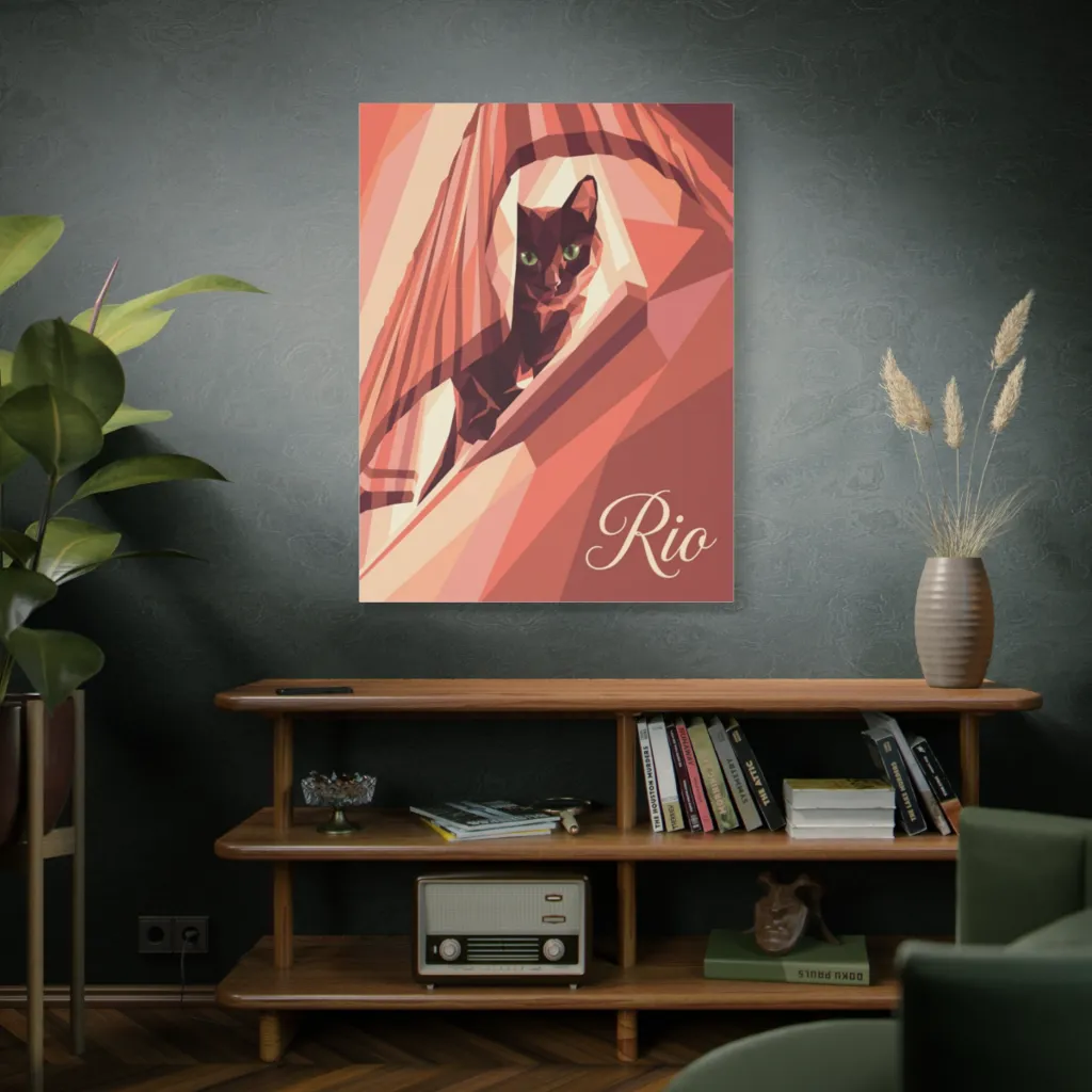 The low-poly geometry exquisitely modernizes Rio's portrait. Bold angularity combined with traditional feline grace creates a strikingly innovative piece. Those glowing green eyes truly pop with digital artistry!