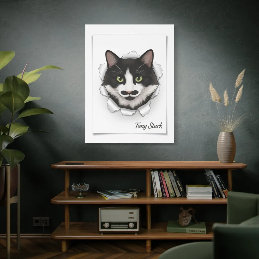 The vibrant reds and cool blues in the torn paper brilliantly complement the tuxedo cat's stark contrast. This playful saturation and chromatic harmony perfectly capture Stark's 'Iron Cat' energy with nerdy precision. Superb!