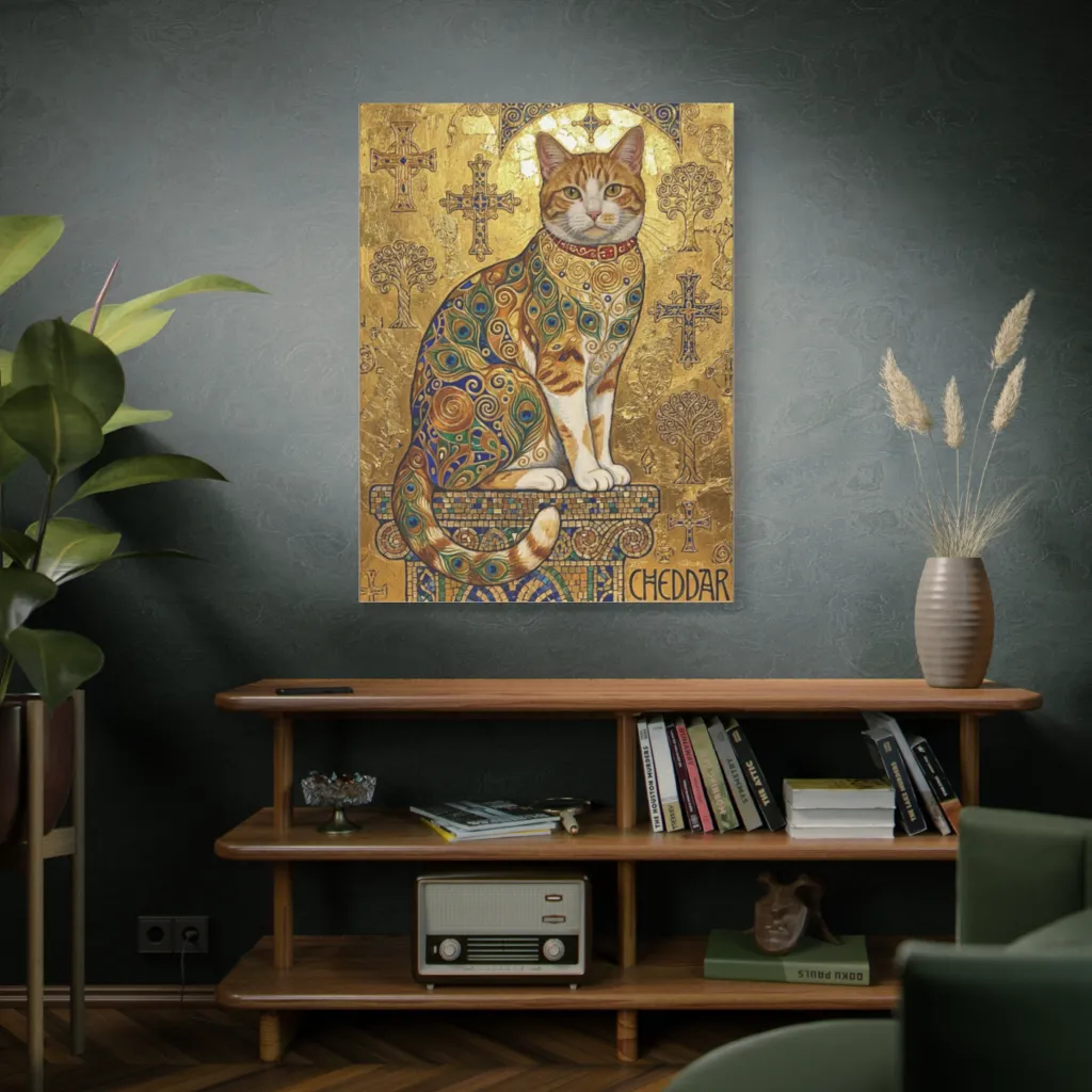 "The Golden Cheddar" radiates majestic serenity and sacred whimsy. It's a daily dose of calm power, inspiring quiet joy. You'll feel charmed, uplifted, and deeply soothed by this benevolent feline icon.