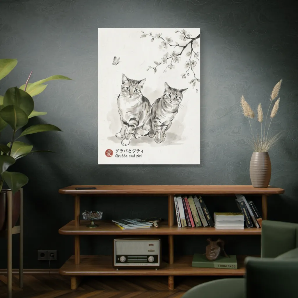The serene gaze of Grubba and Ziti, framed by blossoms, beautifully captures their peaceful, graceful souls. Their calm ink-wash elegance reveals a quiet dignity, truly reflecting their unique feline character.