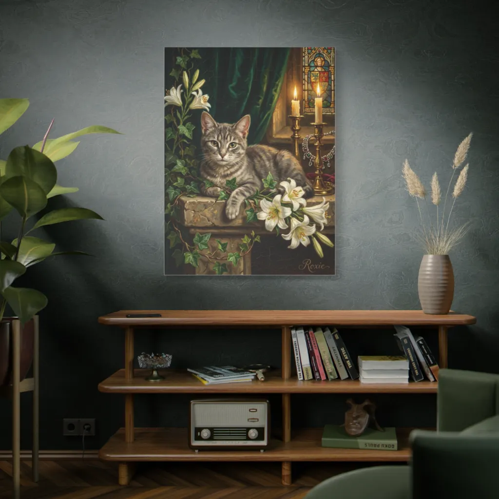This piece evokes serene, old-world comfort. Roxie's regal gaze creates a deeply calming, almost nostalgic atmosphere. It would daily infuse your space with tranquil elegance, a gentle, comforting presence.