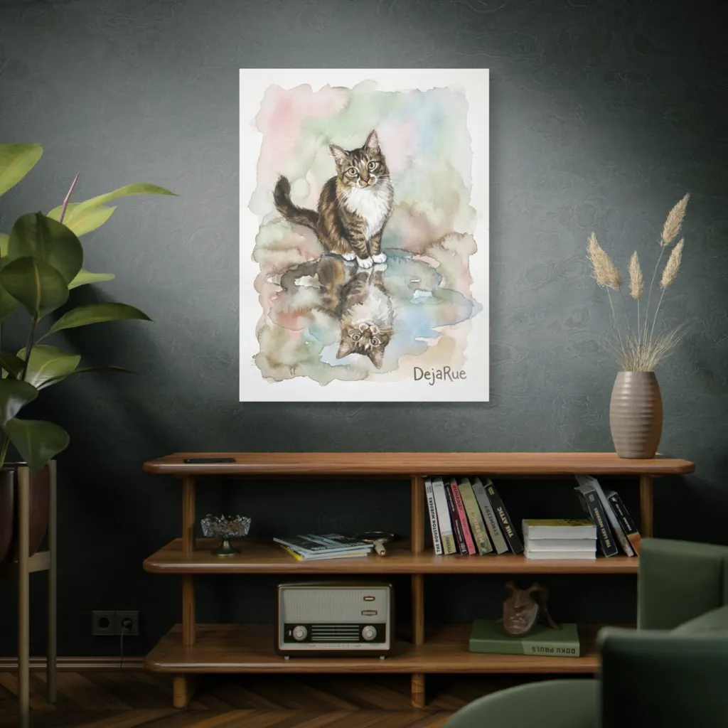 "The Mirrored Gaze" masterfully employs a playful juxtaposition of feline form and aqueous distortion. Its tonal harmony and visceral brushwork elevate DejaRue's profound, if slightly absurd, self-contemplation to an avant-garde triumph. Genius.