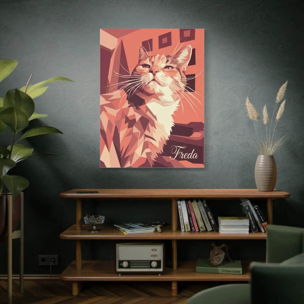 A striking geometric portrait captures a majestic feline surveying its warm, stylized domain with serene confidence. Freda's regal pose suggests she's just ordered more tuna, hold the crumbs.