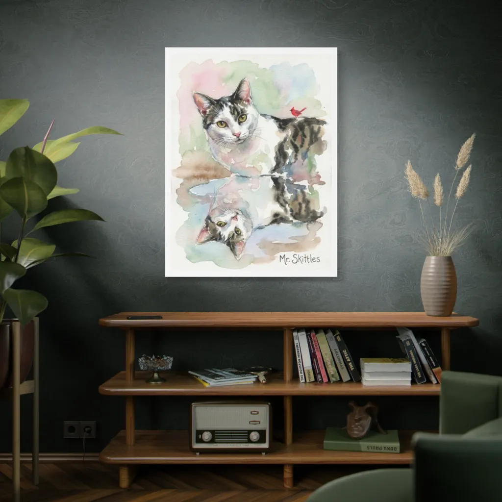 This piece brilliantly merges traditional watercolor softness with a contemporary digital sensibility. The mirrored self-portrait concept is innovative, subtly blending classic portraiture with modern thematic depth. A bold, experimental take on pet art!