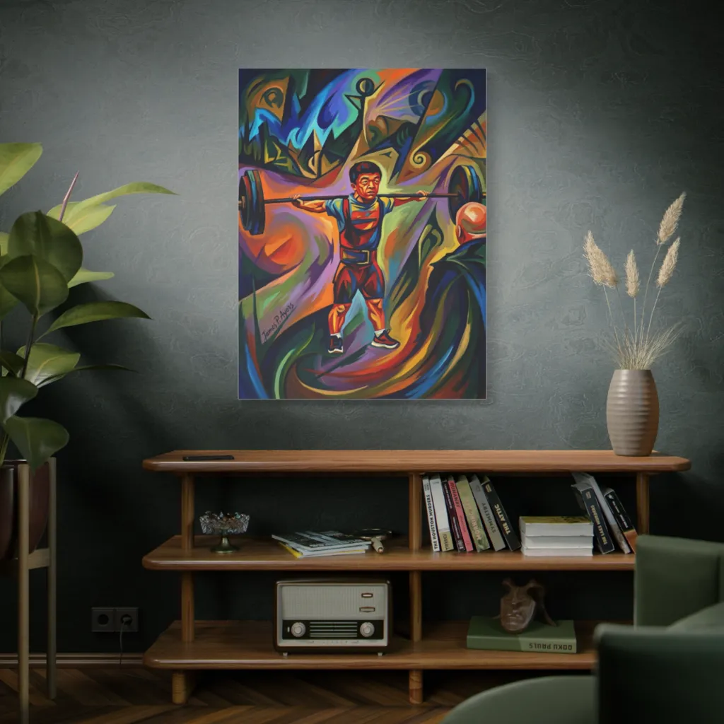 James P. Ayers masterfully paints this strongman, proving even a tiny titan can lift massive weights with colorful conviction.