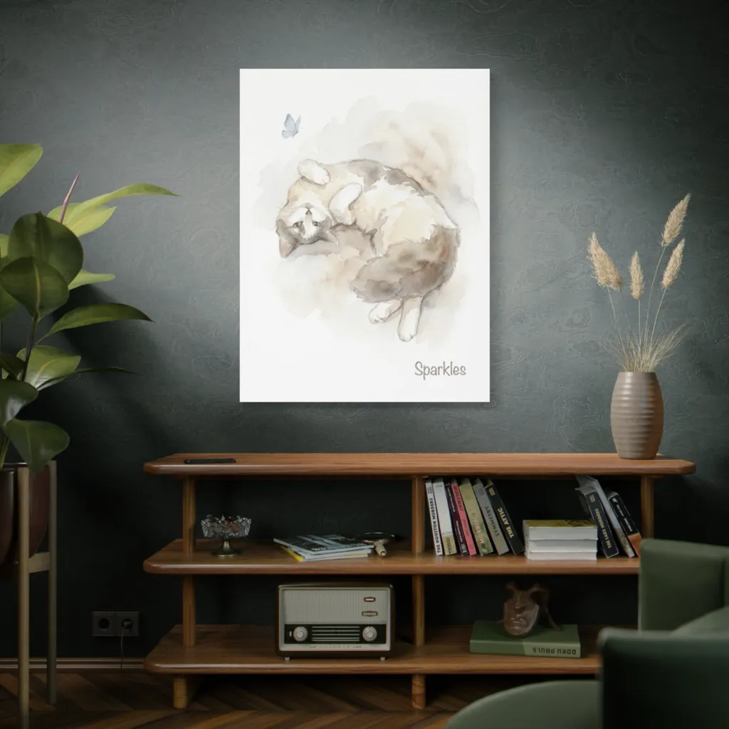 Dreamy watercolors capture a contented cat, belly-up, whimsically eyeing a butterfly, creating a soft, utterly charming scene.