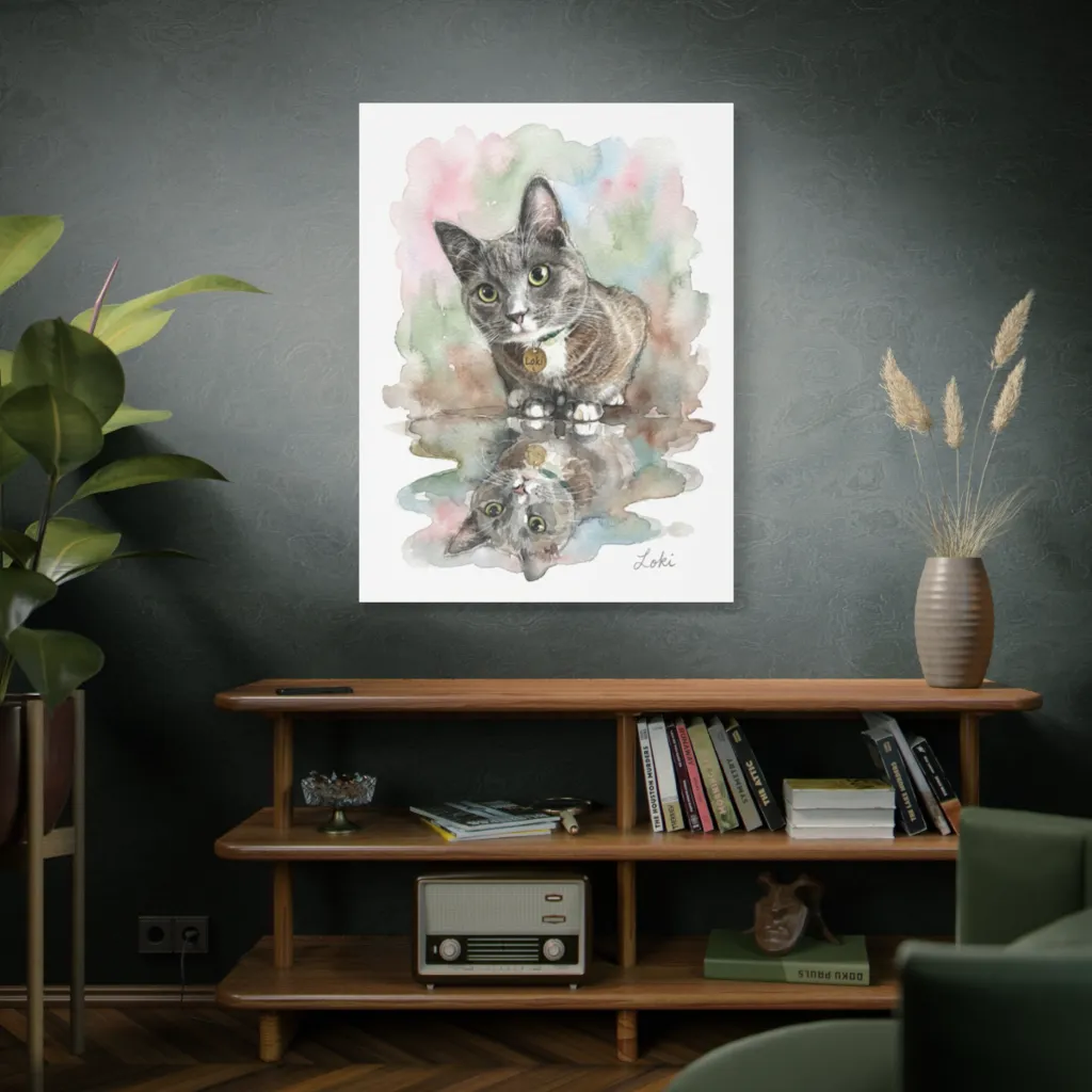 This piece brilliantly blends classic watercolor with a contemporary "inverted reflection" concept. It's a bold, innovative take on pet portraiture, celebrating Loki's illusory nature through clever visual storytelling.
