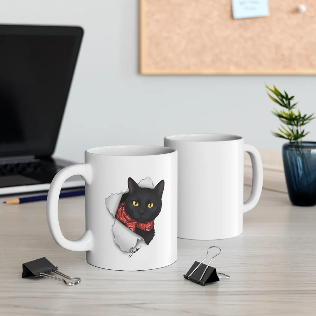 This witty digital piece captures a bandana-sporting black cat peeking through a trompe l'oeil tear, radiating playful mischief. Shadow, ever the playful rebel, simply couldn't wait for an invitation, opting to tear into the scene.