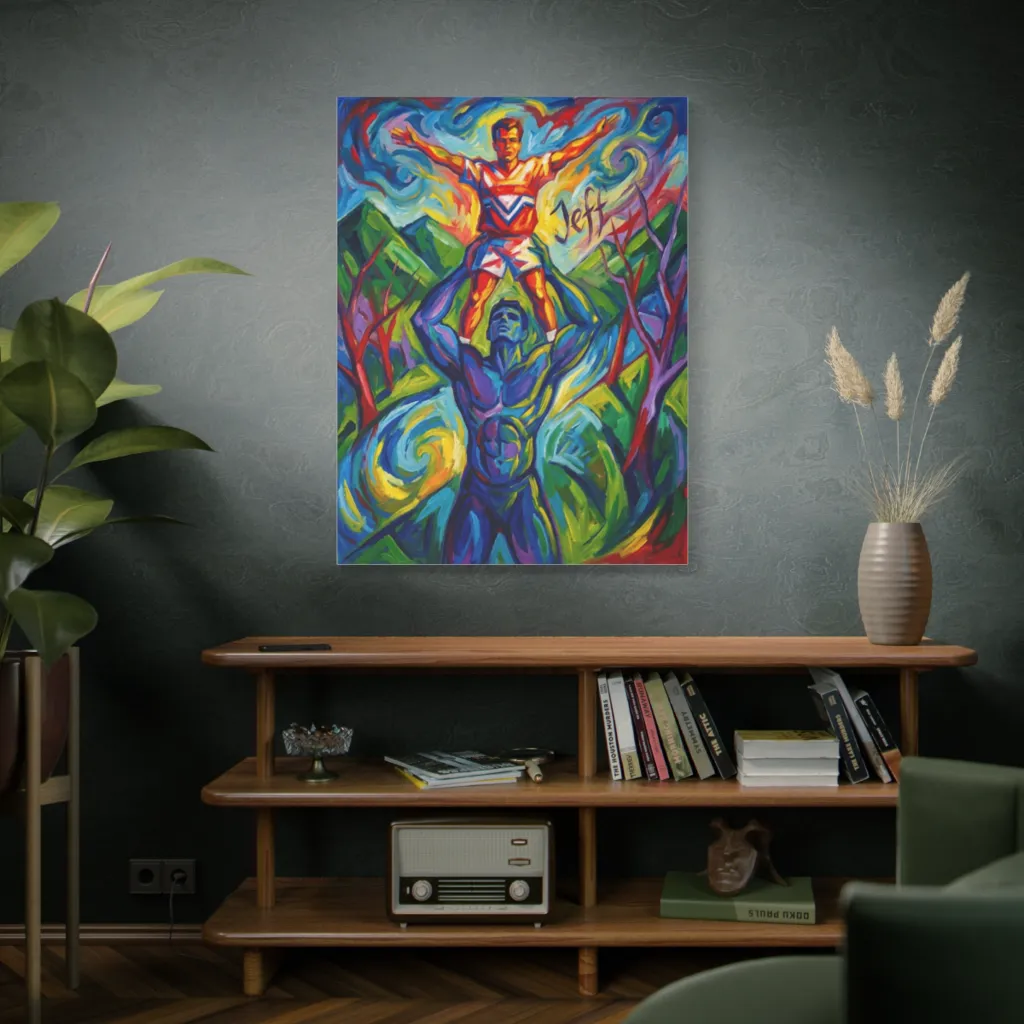 The Fauvist palette electrifies Jeff's ascent! Bold primaries and secondary complements create jubilant energy. High saturation and warm-cool contrasts brilliantly capture his athletic triumph and vibrant spirit. Chromatic harmony sings!