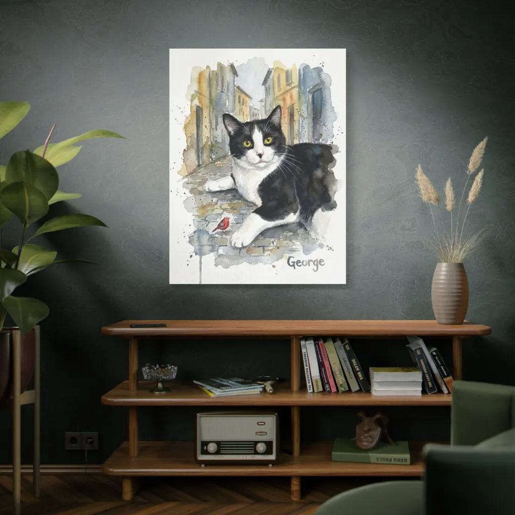 Lively watercolor splatters capture a curious tuxedo cat and its tiny red bird friend in a charming, sun-drenched alleyway. George, ever the sophisticated street dweller, eyes the tiny bird, wondering if it's polite to pounce.