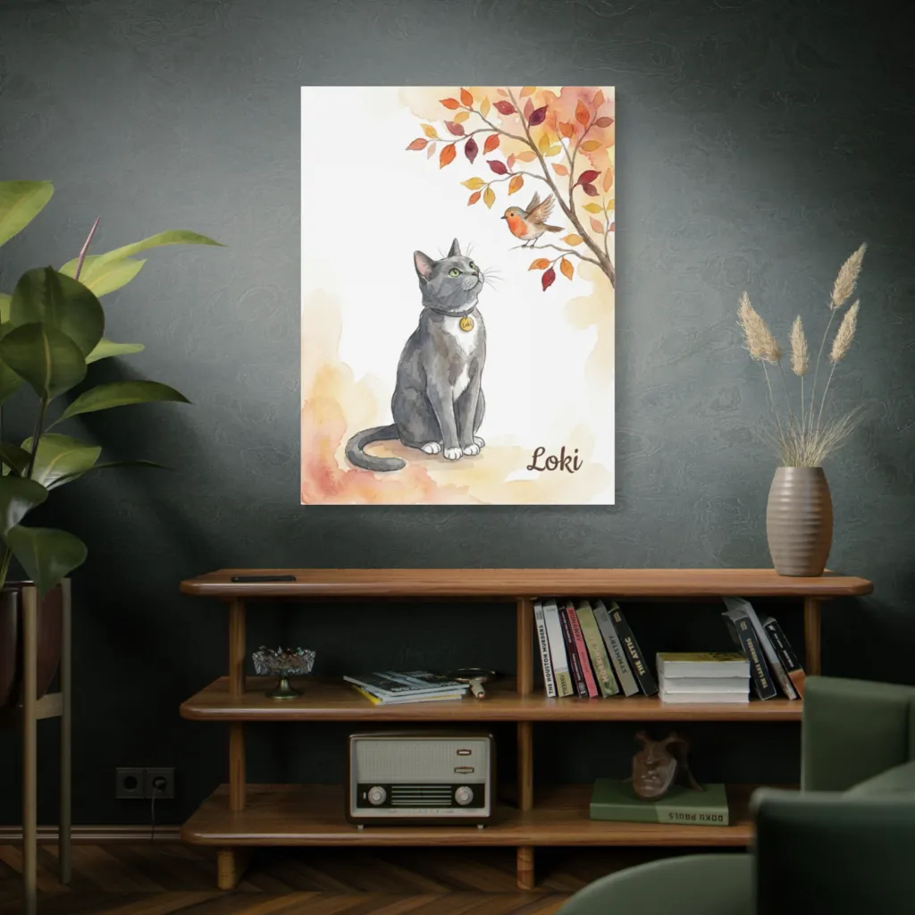 A charming watercolor portrays a curious grey cat captivated by a tiny robin on a vibrant autumnal branch, evoking gentle, serene wonder.