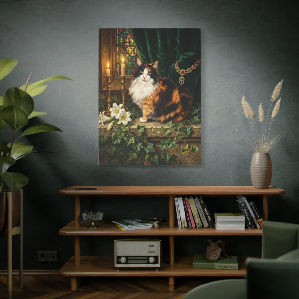 The calico's warm golds against deep jewel tones create stunning chromatic harmony, balanced by candlelight's glow. This saturated palette masterfully conveys Wonder Baby's regal, vibrant energy and dignified presence.