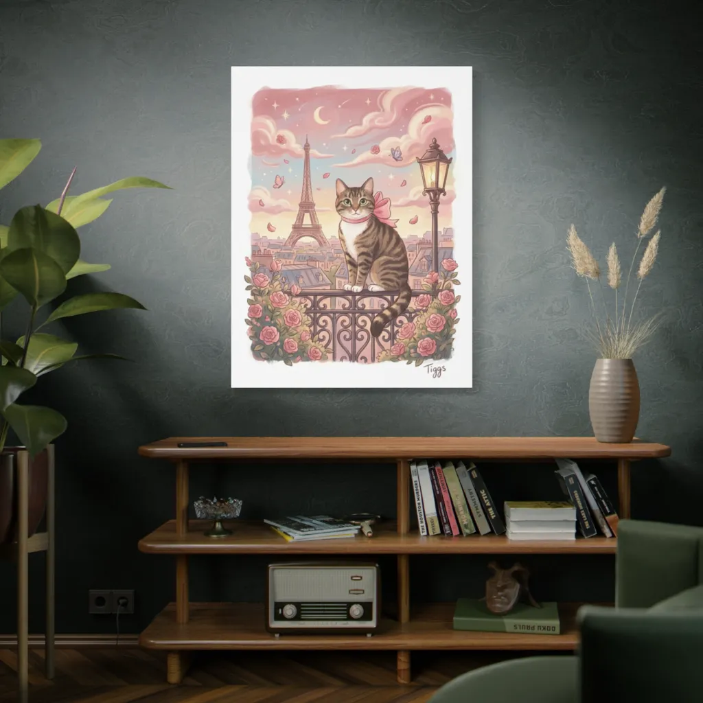 This sweet, pastel illustration features a charming tabby cat admiring a dreamy Parisian skyline, evoking a whimsical and romantic mood. Tiggs, a true Parisian connoisseur, surveys her rose-adorned kingdom from the balcony, utterly charming.