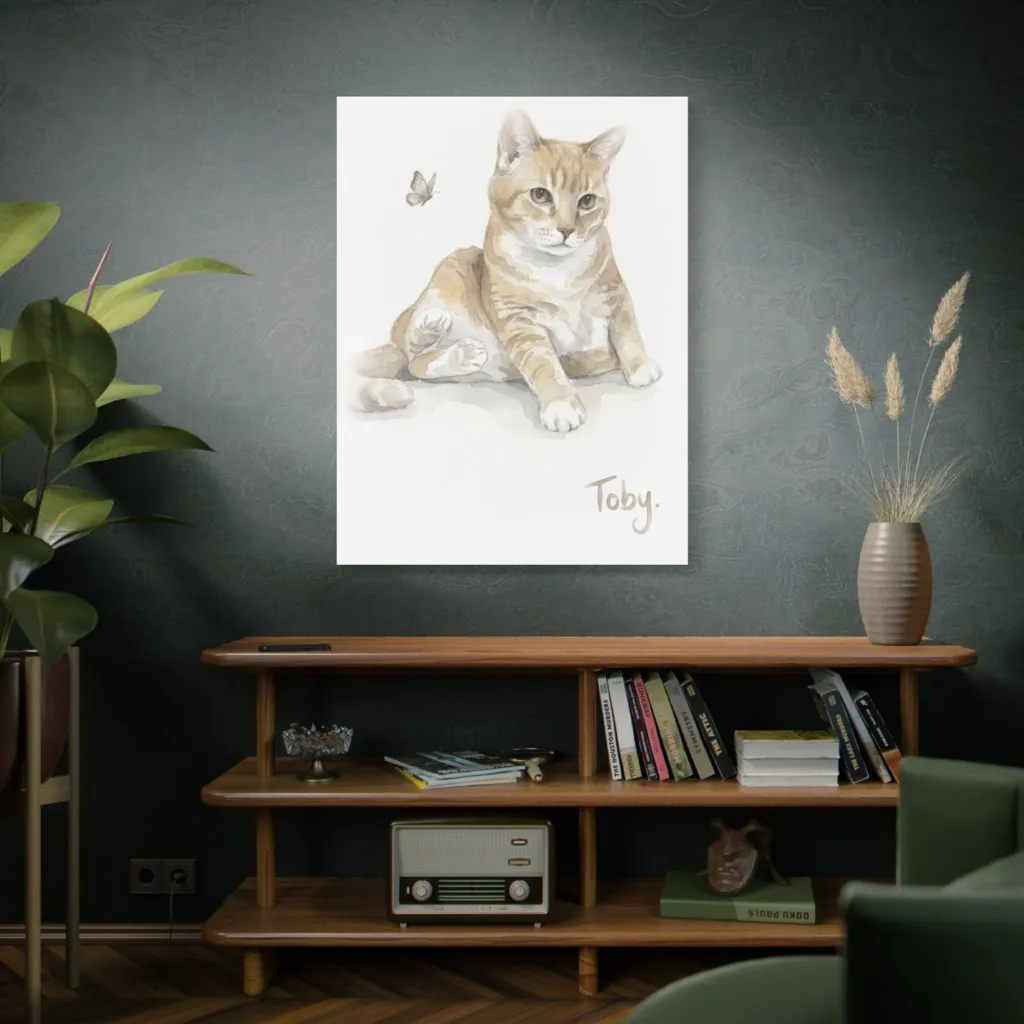 Toby's curious appraisal, mid-lounge, captures his gentle, thoughtful soul perfectly. The watercolor truly reveals his unique tabby charm and the essence of his sweet, inquisitive nature.