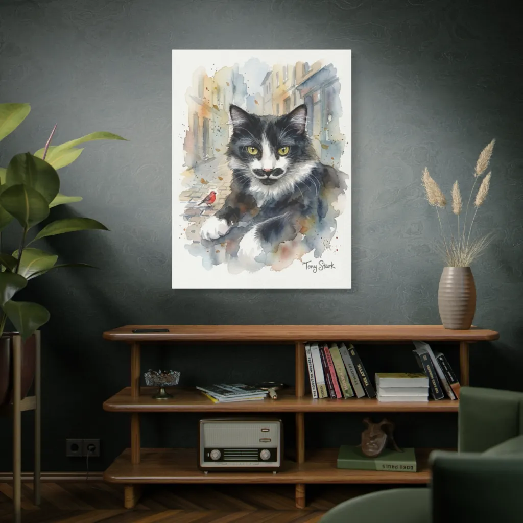 Even Tony Stark might envy this dapper, watercolor cat's sophisticated mustache and captivating gaze.